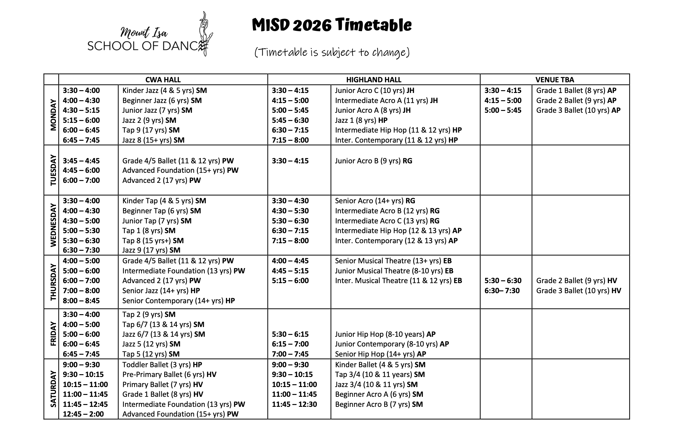 For a printable version of the 2026 Term 1 timetable, please click MISD 2026 Timetable